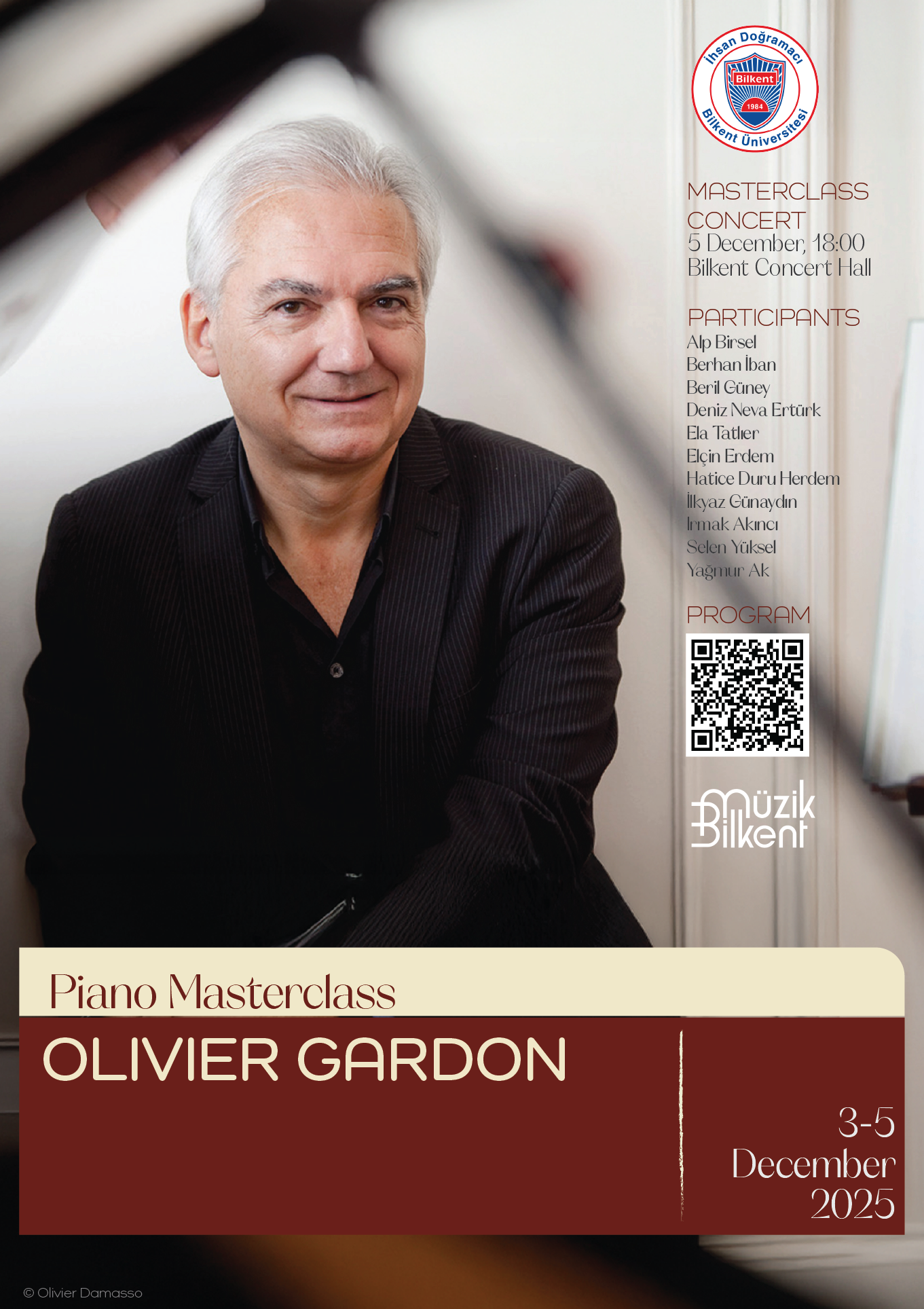 3–4–5 Aralık tarihlerinde Bilkent Üniversitesi Müzik ve Sahne Sanatları Fakültesi’nin konuğu olarak Ankara’ya gelecek olan Olivier Gardon, piyano öğrencileriyle üç gün boyunca ustalık sınıfları gerçekleştirecektir. Program, 5 Aralık Cuma günü yapılacak öğrenci konseriyle sona erecektir.
